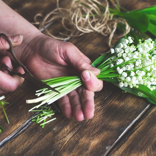 Si votre muguet est en brins, placez-les rapidement dans un vase d’eau fraîche. Recoupez les brins (toujours en biais) avec des ciseaux et plongez-les dans une dizaine de centimètres d’eau. Évitez les courants d’air, sources de chaleur (radiateur, ordinateur, cuisinière, climatiseur) et l’exposition directe au soleil pour une conservation optimale.