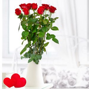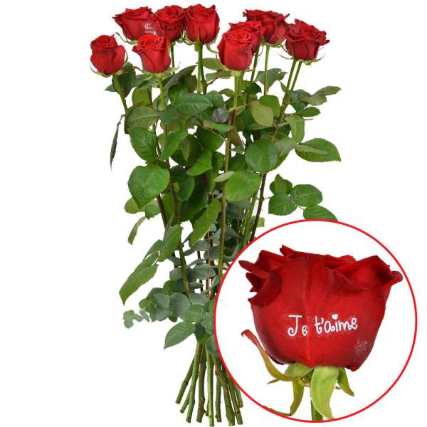 Cette brassée de 12 roses rouges à gros boutons (60cm) est accompagnée d’une rose spéciale marquée “Je t’aime”. Un symbole fort pour témoigner de l’amour infini que vous portez à votre moitié. Le vase n’est pas compris dans le bouquet.