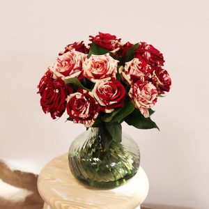 Ce bouquet de roses est une véritable œuvre d’art florale, captivant le regard avec ses pétales d’un rouge framboise et d’un blanc immaculé. Cette combinaison de couleurs évoque la passion et la pureté, créant un contraste saisissant.