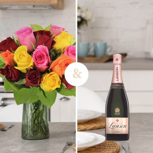 Un bouquet de 15 roses multicolores accompagné d’une demi bouteille de Champagne rosé Lanson de 37.5cl