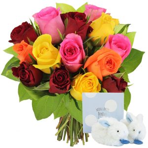 Offrez un bouquet de 15 roses multicolores accompagné de son coffret de naissance bleu