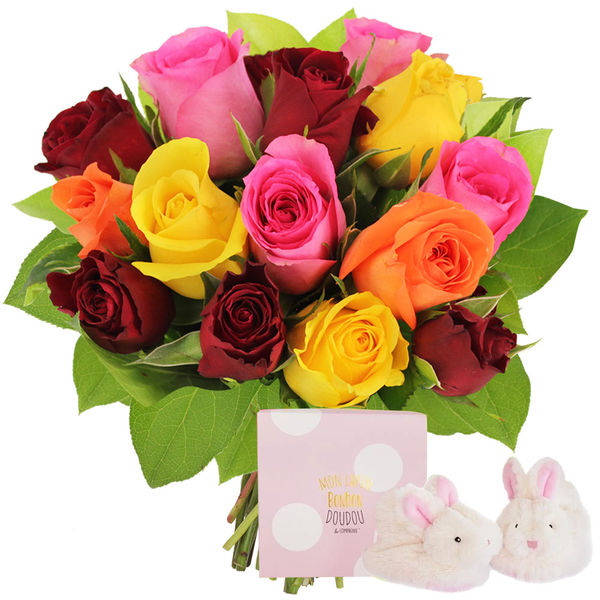 Pour célébrer la naissance d’un bébé, optez pour ce bouquet de 15 roses multicolores accompagné d’un coffret de naissance rose. Ce dernier contient une paire de petits chaussons signés Doudou&Compagnie, pour souhaiter la bienvenue au nouveau-né.
