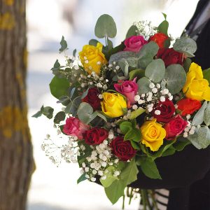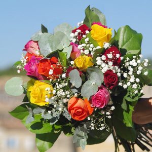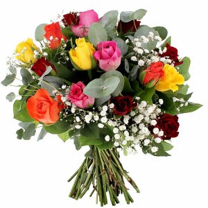 Offrez ce bouquet composé de 15 roses multicolores accompagnées de gypsophile et d’eucalyptus en guise de feuillage pour évoquer la diversité de l’amour dans toutes ses nuances.