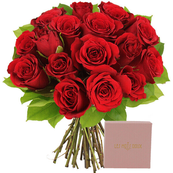 Accompagné d’une brassée de 15 roses rouges fraîches, cet ensemble fera fondre de bonheur votre maman, votre amie, votre sœur, et bien plus encore.