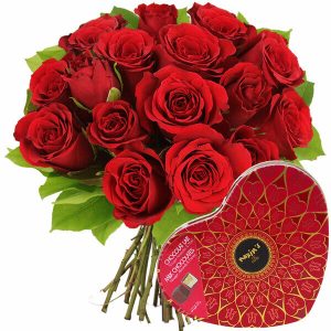 Offrez un cadeau gourmand et romantique avec ce ravissant bouquet de 15 roses rouges accompagné d’un cœur métallique rouge contenant 90g de délicieux chocolats au cœur fondant de nougat, d’amandes et de miel signés Maxim’s. Ce duo parfait est idéal pour célébrer un anniversaire ou pour exprimer vos sentiments lors de la Saint-Valentin.