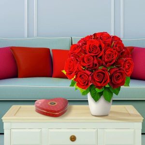 Une touche de romance avec ce bouquet de roses rouges et son cœur métallique de chocolats