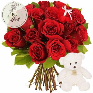 Offrez à votre bien-aimé(e) un bouquet de 15 roses rouges accompagné d’un ourson en peluche blanc de fabrication française, signé Histoire d’Ours. L’ourson mesure 20 cm et apportera une touche de douceur à ce cadeau romantique.