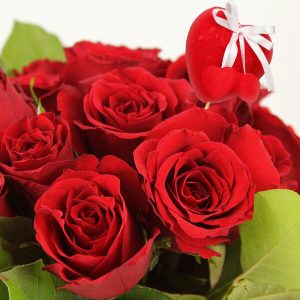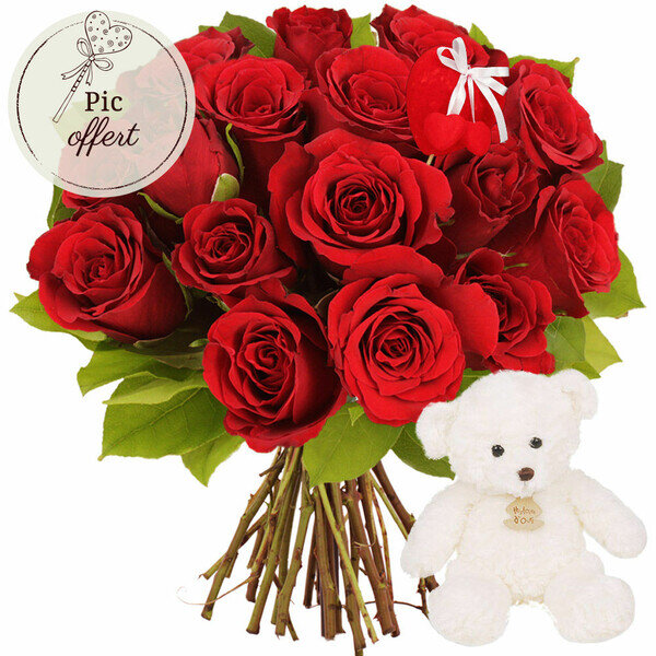 15 ROSES ROUGES + PIC CŒUR + OURSON BLANC