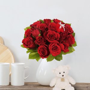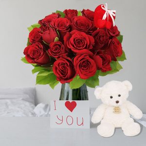 Bouquet de roses rouges et ourson en peluche