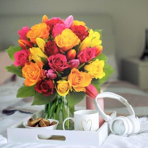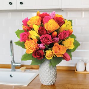 Succombez au charme de cette jolie brassée de roses et tulipes multicolores, choisies avec soin par Florajet. Exprimez toute votre reconnaissance et votre affection à l’un de vos proches avec cette élégante création florale.