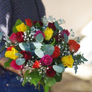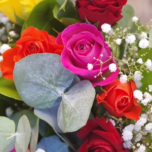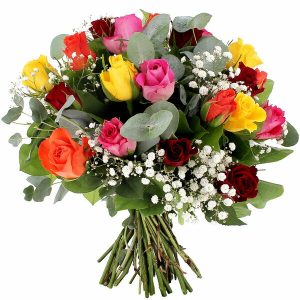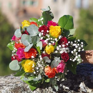 Les magnifiques roses multicolores du bouquet Calista sont accompagnées de gypsophile et d’eucalyptus en guise de feuillage, pour un rendu à la fois élégant et raffiné. Chaque fleur est choisie avec soin pour offrir un bouquet harmonieux et plein de charme.