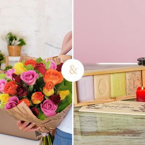 Un bouquet de roses multicolores accompagné d’un coffret de savonnettes parfumées