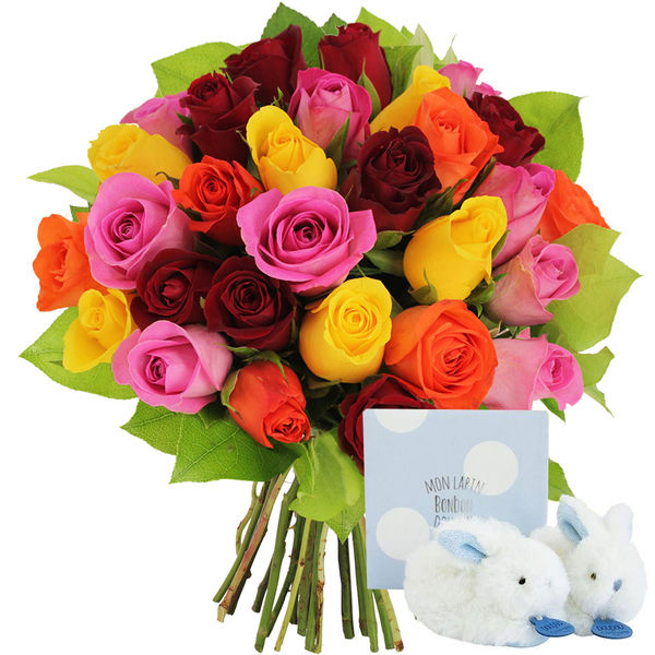 En plus de ce bouquet de roses, vous recevrez un coffret de naissance bleu contenant une paire de chaussons en forme de lapins signés Doudou&Compagnie. Un présent précieux et irremplaçable à offrir sans hésitation.