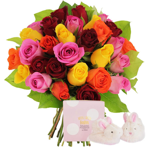 30 roses multicolores + chaussons roses lapin