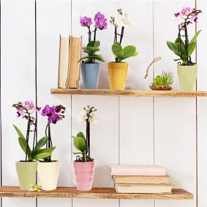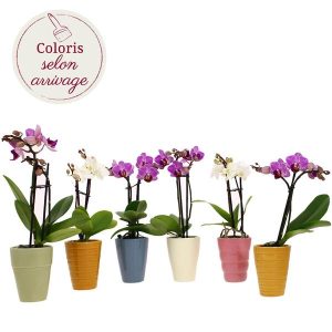 Cet ensemble comprend 6 mini orchidées accompagnées de leurs pots aux couleurs variées (selon arrivage).