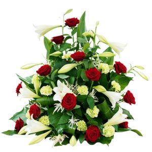 Devant de tombe pour deuil : un hommage floral en blanc et rouge