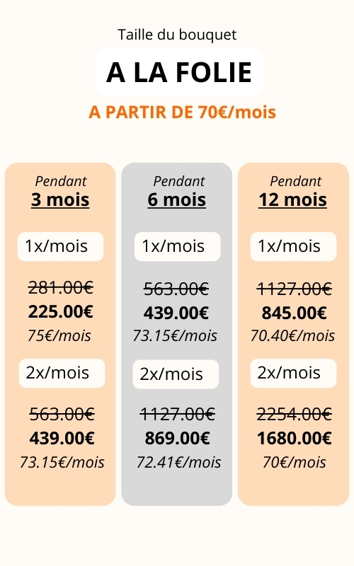 Avec l’abonnement de bouquets de fleurs Monsieur Marguerite, vous pouvez créer un abonnement sur mesure. Vous choisissez la taille de votre bouquet (beaucoup, passionnément, à la folie), la fréquence de réception des bouquets (1 à 2 fois par mois), la durée de votre abonnement (mensuel, 3, 6 ou 12 mois), ainsi que la possibilité d’envoyer la carte cadeau par mail ou directement par courrier au destinataire. Cet abonnement flexible vous permet à tout moment, depuis votre espace client, de mettre en pause, de changer la date ou l’adresse de livraison. Pour toute question, notre service client est disponible par mail, chat ou téléphone.