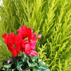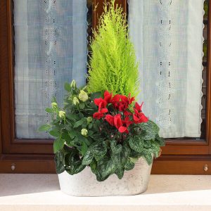 Un mélange de plantes dans les tons de rouge, blanc et vert, comprenant un cyprès et des plantes fleuries, dans une coupe ronde (le contenant peut varier en fonction des disponibilités et les plantes en fonction des saisons).