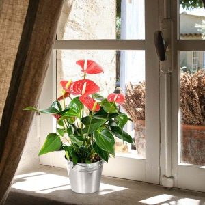 Un anthurium rouge dans son pot zinc