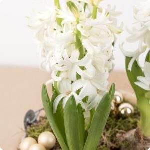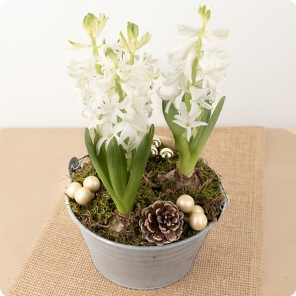 Si vous souhaitez offrir un cadeau original et parfumé pour les fêtes de fin d’année, optez pour cet arrangement de jacinthes au doux parfum de Noël. Les bulbes de jacinthes sont livrés en boutons, pour que vous puissiez profiter du plaisir de voir les fleurs de jacinthe éclore.