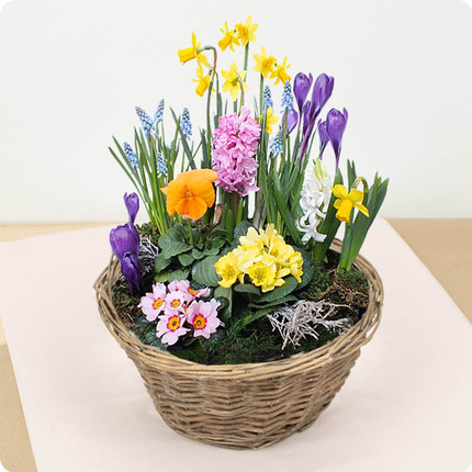Offrez un peu de printemps à une personne chérie avec notre charmant panier de plantes printanières sur un lit de mousse naturelle. Cette composition de bulbes comprend des jonquilles, des jacinthes, des crocus, des pensées et des primevères, ainsi que de la mousse naturelle. Une fois replantées dans un jardin, un pot à la fenêtre ou sur un balcon, ces plantes fleuries et bulbes refleuriront chaque année pour le plus grand plaisir de vos proches.