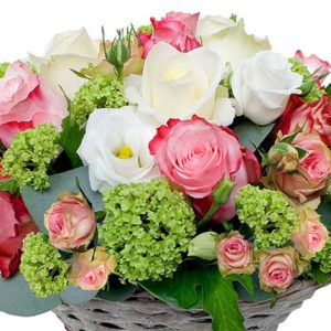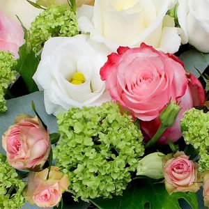 Offrez à vos proches un cadeau tendre et raffiné avec cet arrangement de roses et fleurs de saison dans des tons rose, blanc et vert. Apportez une touche de printemps dans leur intérieur grâce à cette composition élégante.
