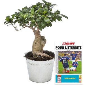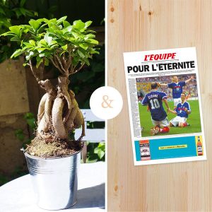 Offrez un cadeau unique et original avec notre duo cadeau pour une occasion spéciale ! Nous vous proposons un bonsaï Ginseng de 40/45cm de hauteur dans son pot de 14cm de diamètre, accompagné d’une impression personnalisée de la Une du journal L’Equipe au format A3 (grammage 200g). Choisissez la date de l’impression et marquez cette journée mémorable avec cet arbre miniature emblématique.