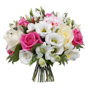 Découvrez notre bouquet de mariage “Légèreté et tendresse” aux tons blanc crème et rose. Un mélange subtil de roses rose et crème, de fleurs de saison blanches et roses, et d’un discret feuillage vert foncé, pour un bouquet à l’aspect léger et élégant.