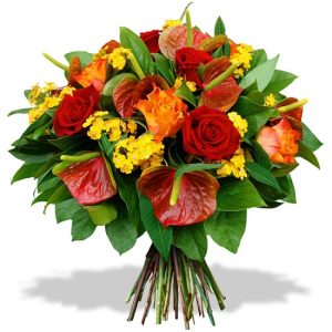 Ce bouquet est composé de roses rouges, rehaussées de fleurs de saison aux tons rouges et jaunes, mis en valeur par un beau feuillage vert soutenu.