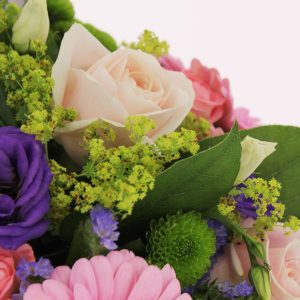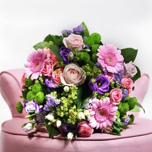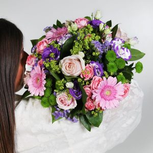 Composition : roses, gerberas, lisianthus fleurettes et feuillages dans les tons rose, fuchsia, violet et blanc.