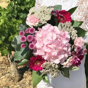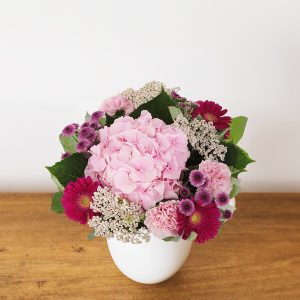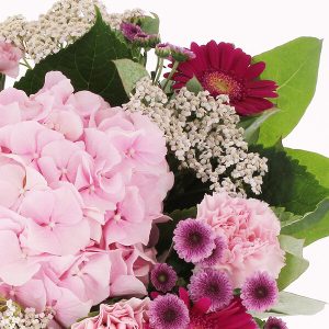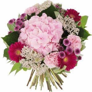 Composé d’hortensia, de germinis et d’autres fleurs de saison, ce bouquet est une explosion de couleurs dans les tons roses. Chaque fleur a été soigneusement choisie pour créer un bouquet unique et plein de charme.