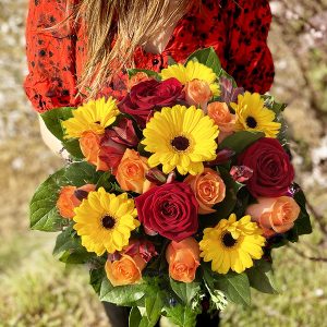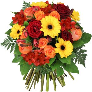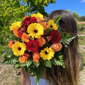 Bouquet rond dans les tons rouge, orange, jaune et vert, composé de petites roses, germinis, fleurettes et feuillages.