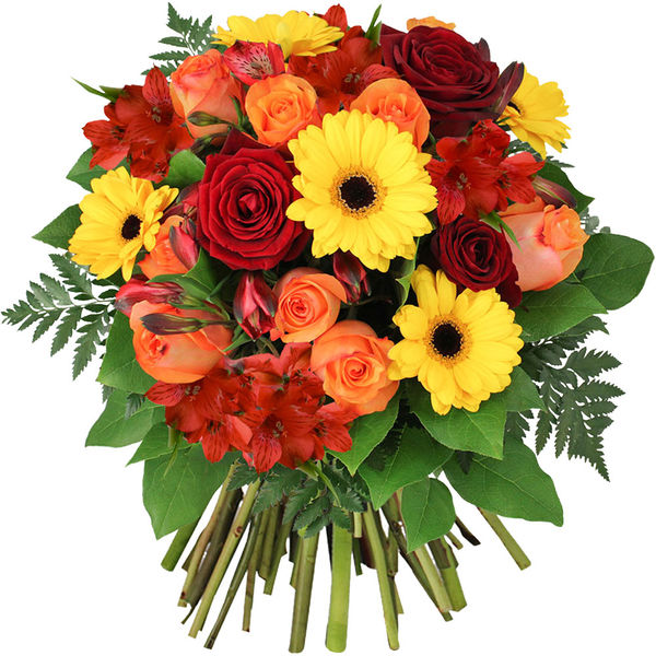 Bouquet rond dans les tons rouge, orange, jaune et vert, composé de petites roses, germinis, fleurettes et feuillages.