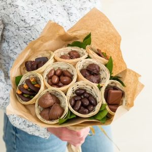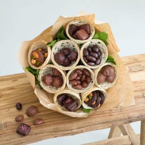 Ce bouquet gourmand est réalisé uniquement avec des chocolats noirs et laits, promettant un véritable régal des sens. Savourez des rochers, amandines, mendiants, escargots, pralinés et framboisiers, tous de fabrication française, pour une expérience chocolatée inoubliable.