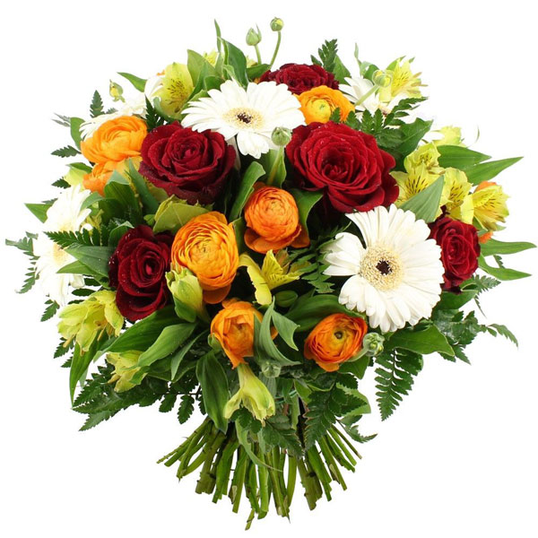 Ce bouquet, nommé Alchimie, se compose de petites roses, germinis, fleurettes et feuillages dans des tons ronds rouge, orange, blanc, jaune et vert. Un véritable feu d’artifice de couleurs pour égayer votre intérieur !