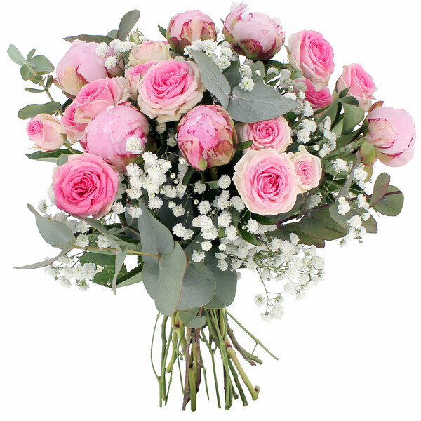 Un bouquet composé de pivoines, roses mini eden, gypsophile et eucalyptus