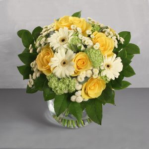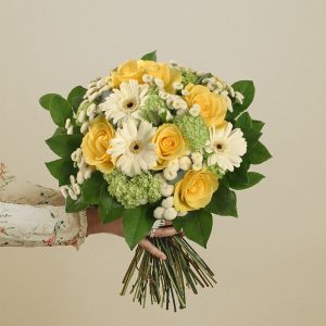 Ce bouquet vous transportera instantanément vers les paysages ensoleillés de la Provence grâce à son mélange ingénieux de roses jaunes et de germinis blancs, sublimés par un feuillage vert éclatant.
