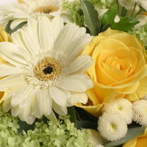 Ce charmant bouquet rond est composé de roses, gerberas, camomilles et feuillages dans des tons jaune, vert et blanc, rappelant les couleurs chaudes des tableaux de Cézanne.