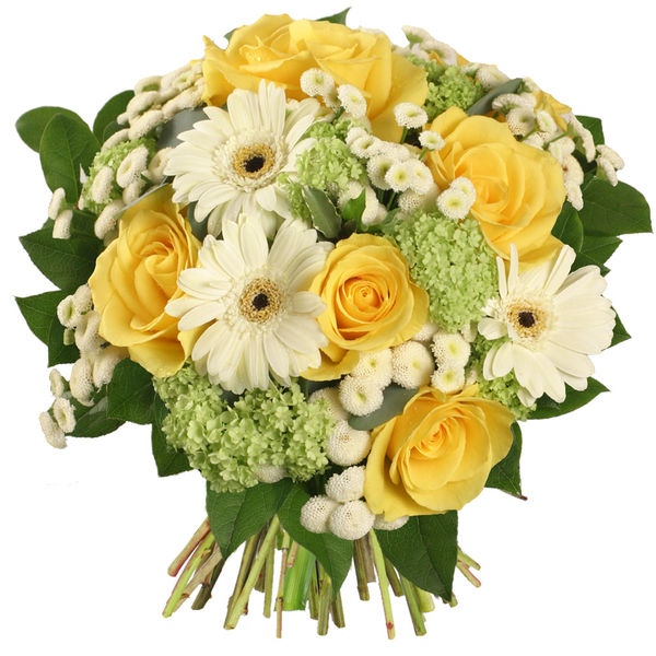 Ce charmant bouquet rond est composé de roses, gerberas, camomilles et feuillages dans des tons jaune, vert et blanc, rappelant les couleurs chaudes des tableaux de Cézanne.