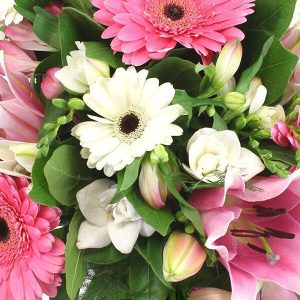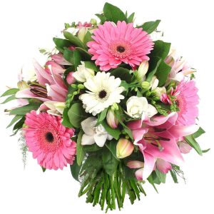 Le bouquet Duchesse est un bouquet rond dans les tons rose et blanc, composé de gerberas, lys, roses, fleurettes et feuillage. Chaque fleur a été choisie avec soin pour créer un équilibre parfait entre les couleurs et les textures.