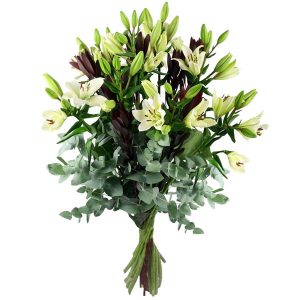 Bouquet longues tiges composé de lys blanc et eucalyptus.