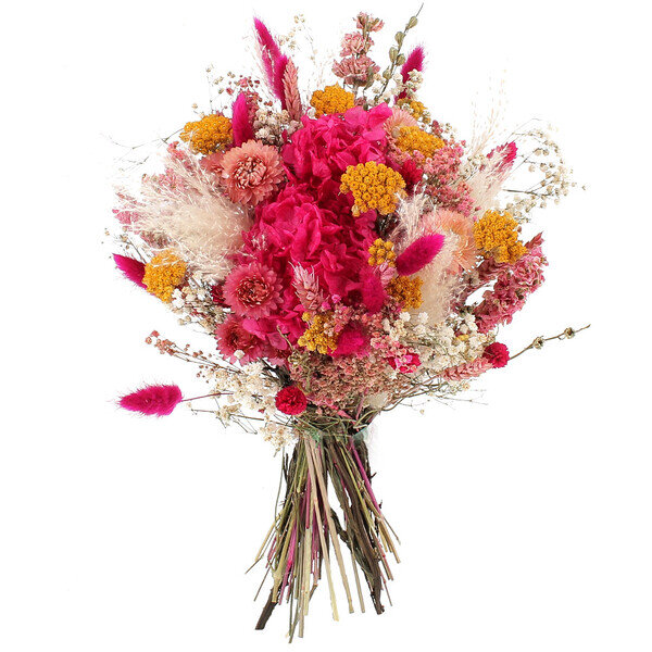 Ce bouquet de fleurs séchées dans les tons roses est composé d’une tige d’hortensia stabilisé accompagnée d’helicrysum, de delphinium, de tarwe, de lagurus, de phalaris, de pampa, de gypsophile et d’achillée. Chaque élément a été soigneusement choisi pour créer une harmonie de couleurs et de textures. Offrez-vous ou offrez à vos proches un bouquet unique et intemporel avec le Baya.