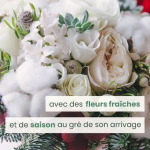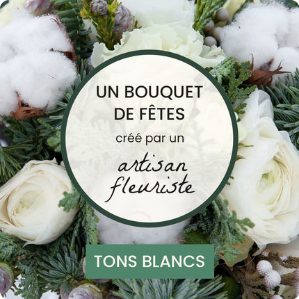Notre artisan fleuriste de 123fleurs met à votre disposition son talent et sa créativité pour réaliser un bouquet festif dans les tons blancs. Composé avec des fleurs et feuillages de saison, ce bouquet sera unique et personnalisé en fonction de l’arrivage du jour.