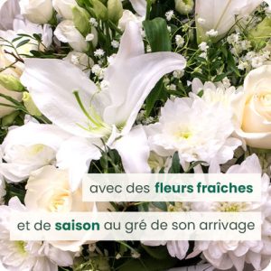 Faites confiance à notre artisan fleuriste pour réaliser un bouquet de deuil dans les tons blancs. Il sélectionnera avec soin de belles roses et des fleurs de saison pour créer une composition unique, en y apportant tout son savoir-faire et sa créativité. La photographie présentée vous donne un aperçu des teintes utilisées par notre fleuriste.