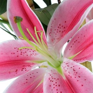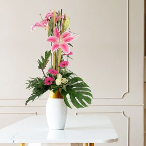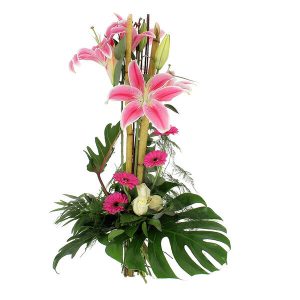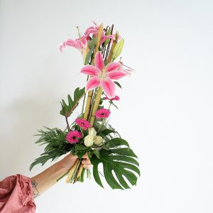 Un bouquet longues tiges dans les tons rose, blanc et vert composé de roses, lys, gerberas et feuillages, la création florale Éventail est une ode à la beauté féminine dans toute sa splendeur. Sa présentation en pyramide accentue son allure fière et altière, tandis que l’arôme suave de ses lys embaume l’air.