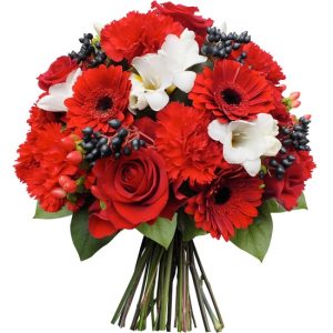 Ce bouquet est un véritable messager de vie, composé de belles roses et de fleurs de saison rouges, de délicates fleurettes blanches, de baies de saison rouges et noires, et d’un feuillage vert foncé en collerette discrète. Les fleurs fraîches sont assemblées avec soin par un artisan fleuriste proche du lieu de livraison, pour une qualité irréprochable.