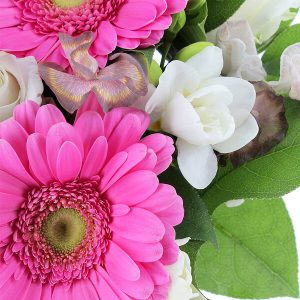 Ce bouquet rond est composé de roses, freesias, gerberas, fleurettes de saison et feuillage. Dans des teintes crème, rose et mauve, il évoque la tendresse et la délicatesse.