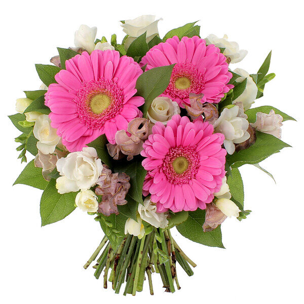 Ce bouquet rond est composé de roses, freesias, gerberas, fleurettes de saison et feuillage. Dans des teintes crème, rose et mauve, il évoque la tendresse et la délicatesse.