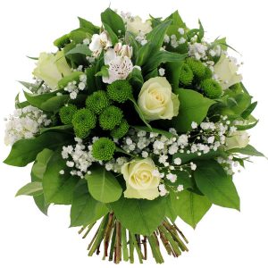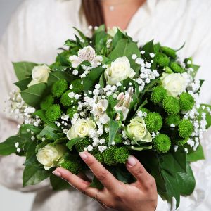 Bouquet rond dans les tons blanc et vert composé de roses, gypsophile, santinis et feuillages.