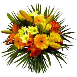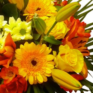 Ce bouquet de fleurs rond et haut est composé de fleurs de saison aux tons jaune et orange brillants, soigneusement sélectionnées par un artisan fleuriste. Fraîchement assemblées, ces fleurs apporteront une touche de gaieté et de couleur à votre intérieur. Offrez-le pour partager votre joie avec vos proches !
